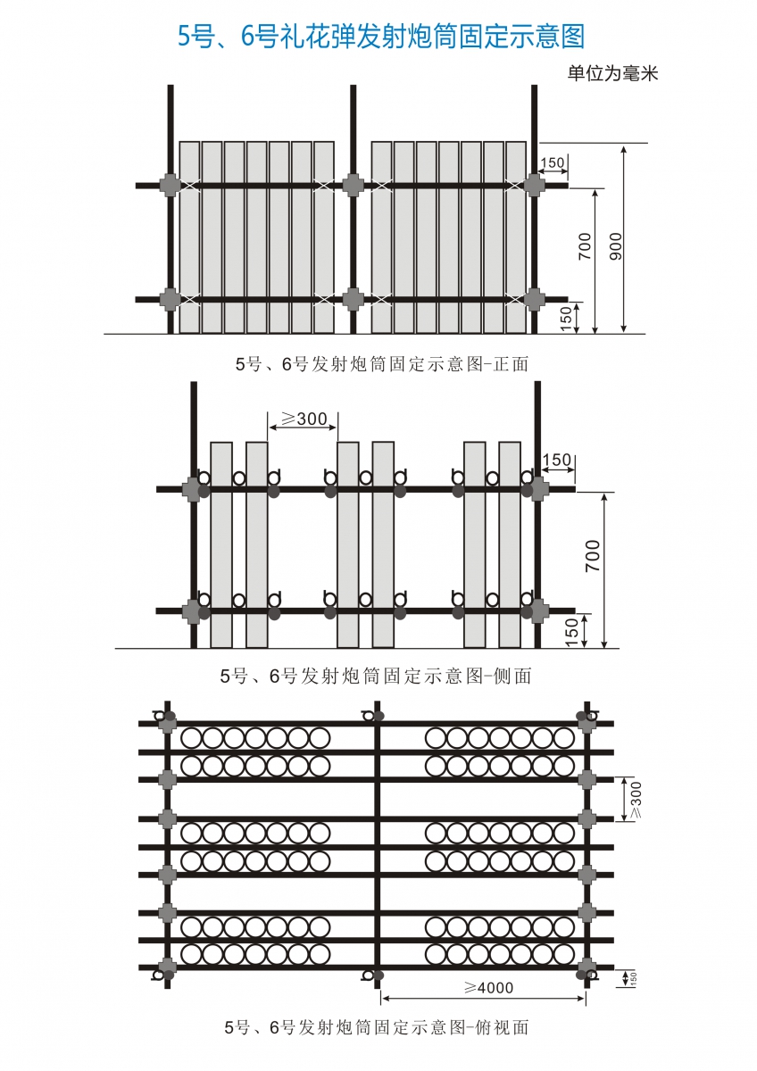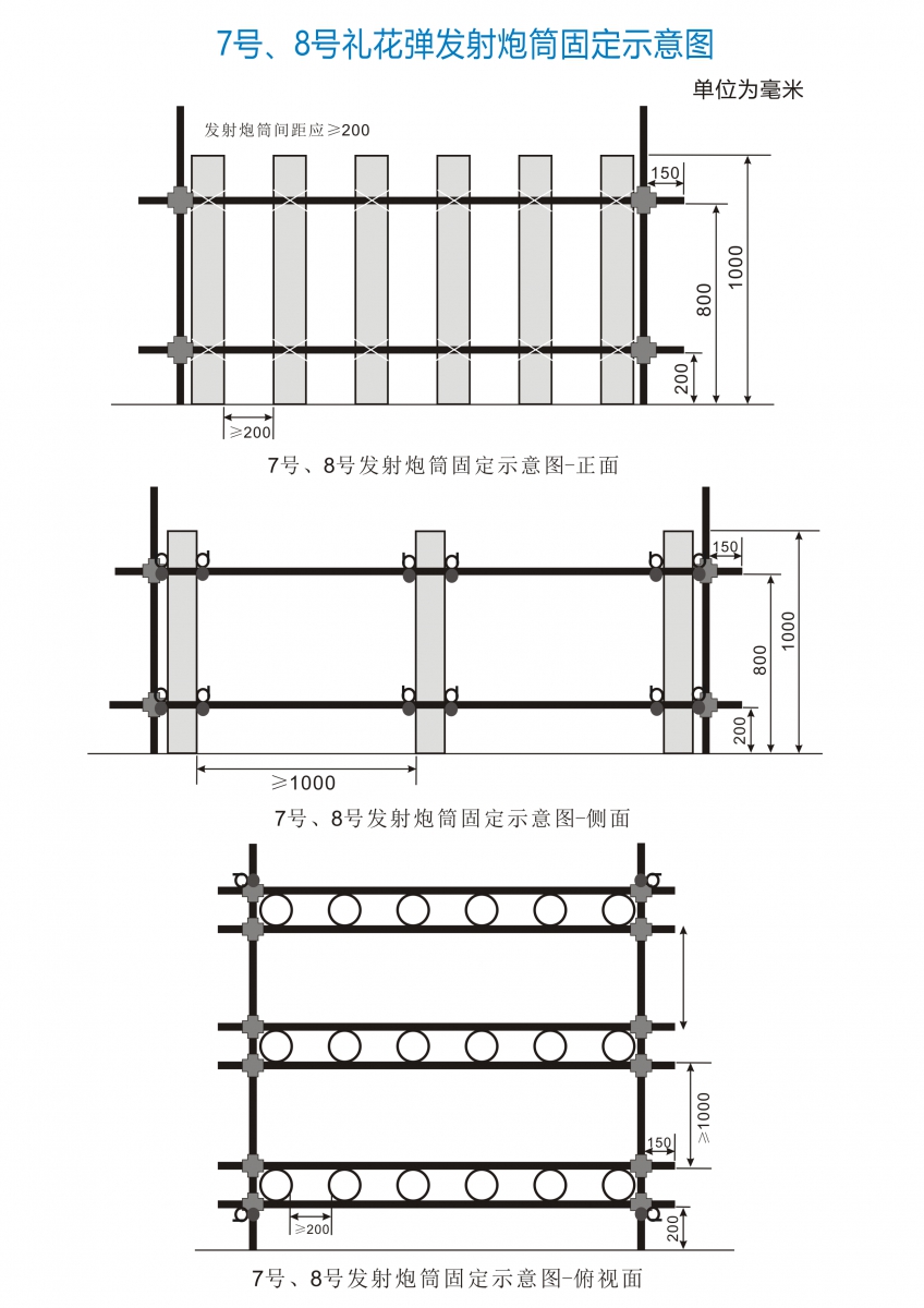 4. 发射炮筒安装完毕后、装填前,现场负责人、技术人员、安全员应逐个进行检查验收,检查内容包括发射炮筒和架子的稳定性、角度、发射炮筒间距等。