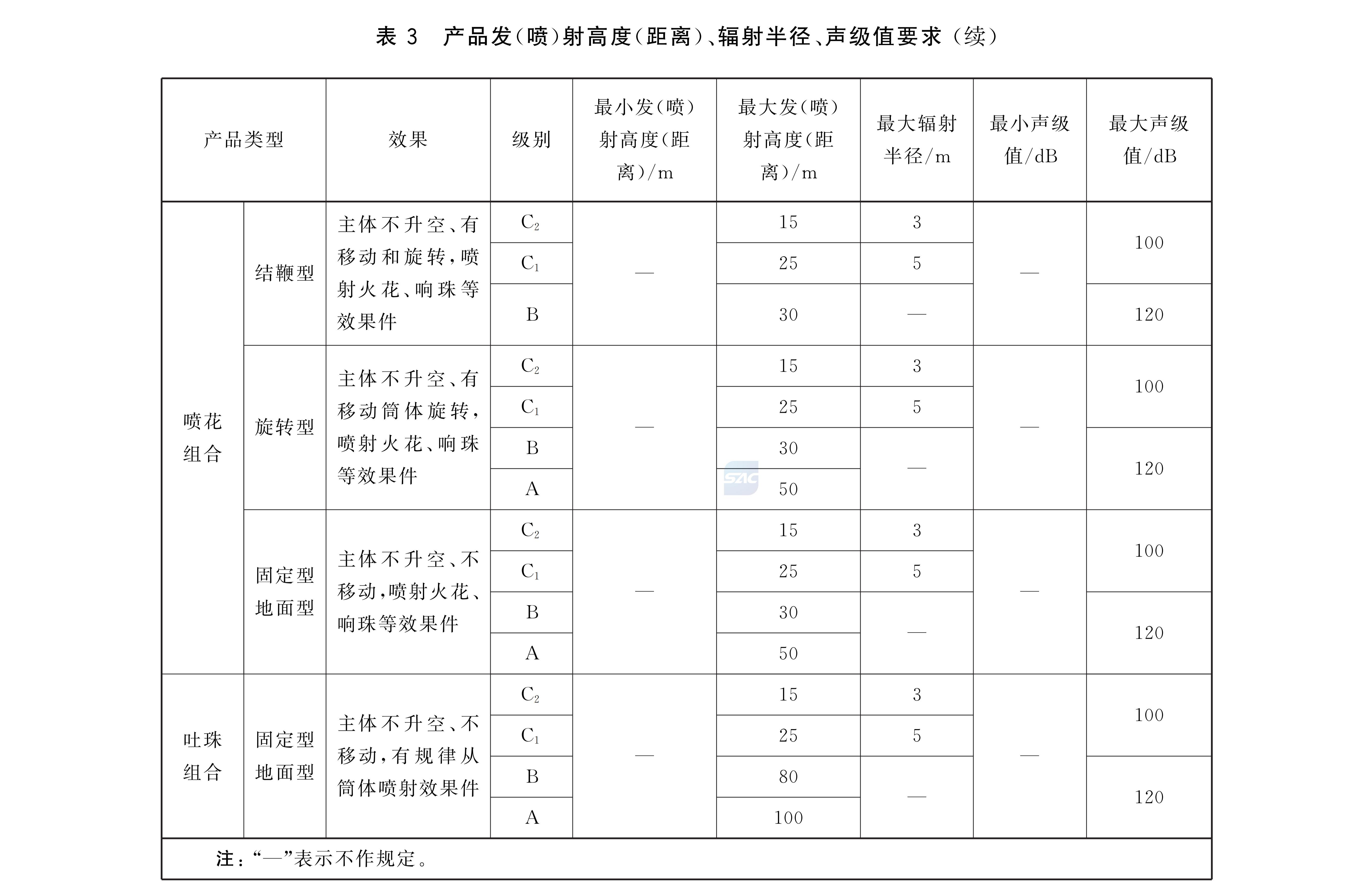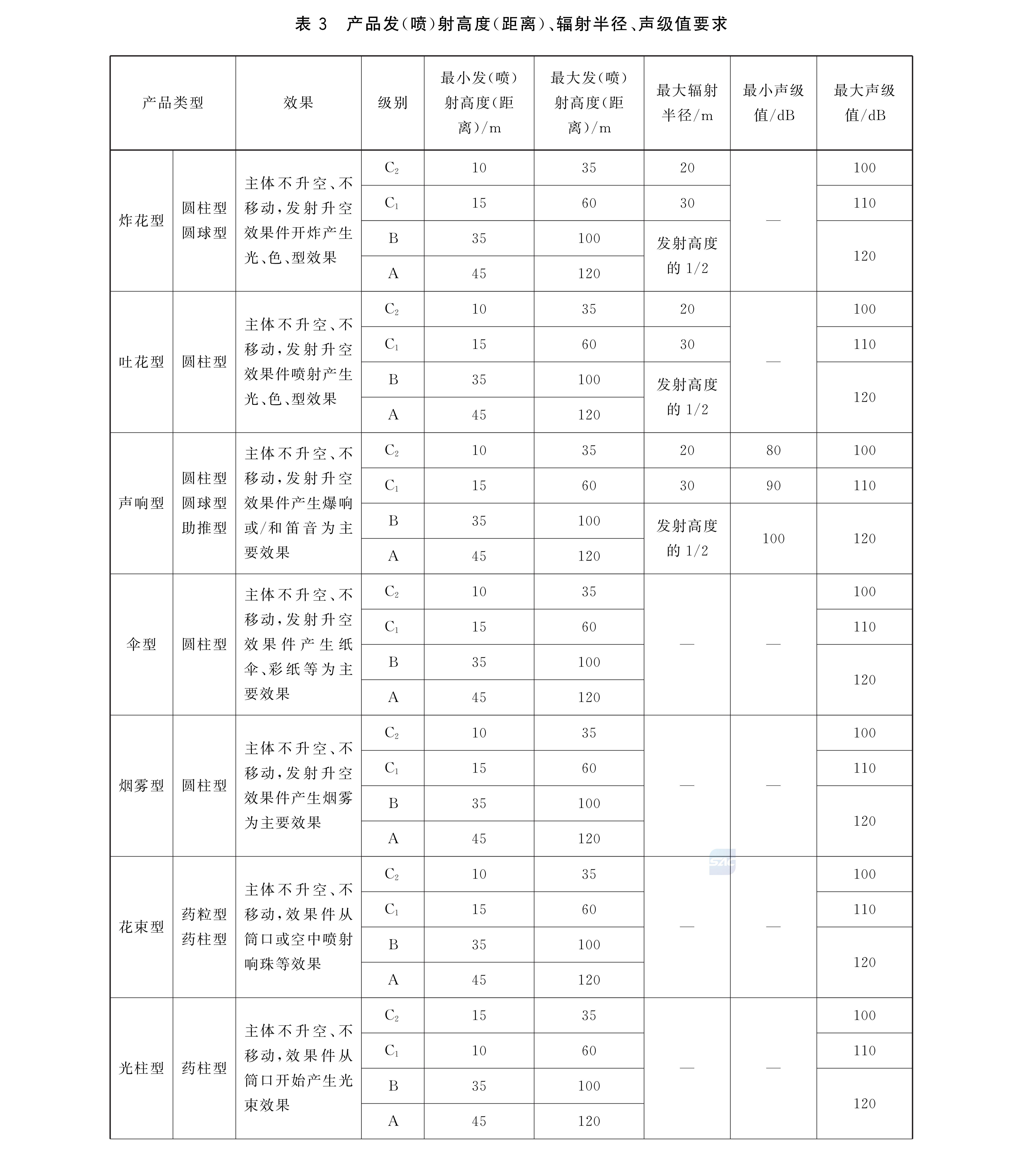 7.8.3 产品燃放时的发(喷)射高度(距离)、辐射半径、声级值等应符合表3要求。