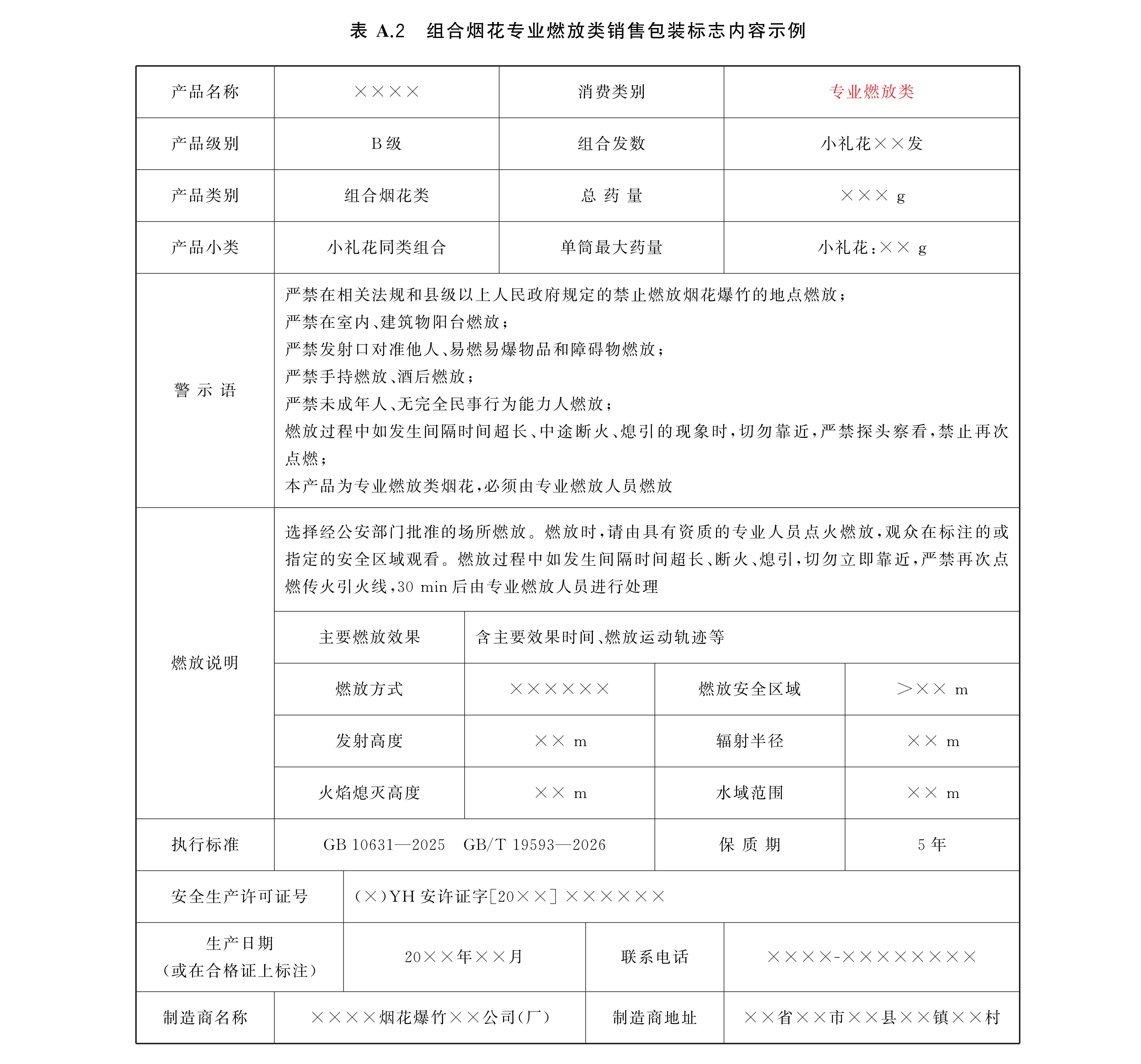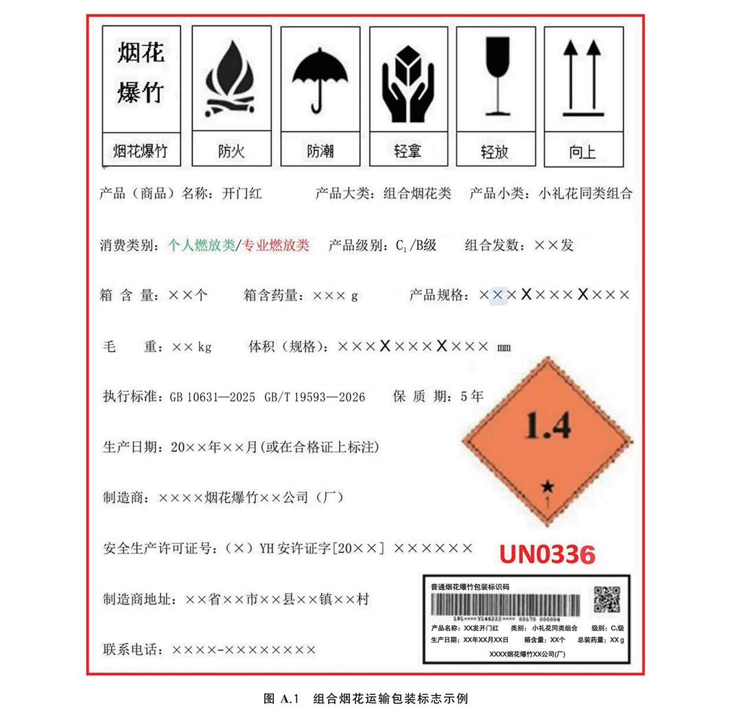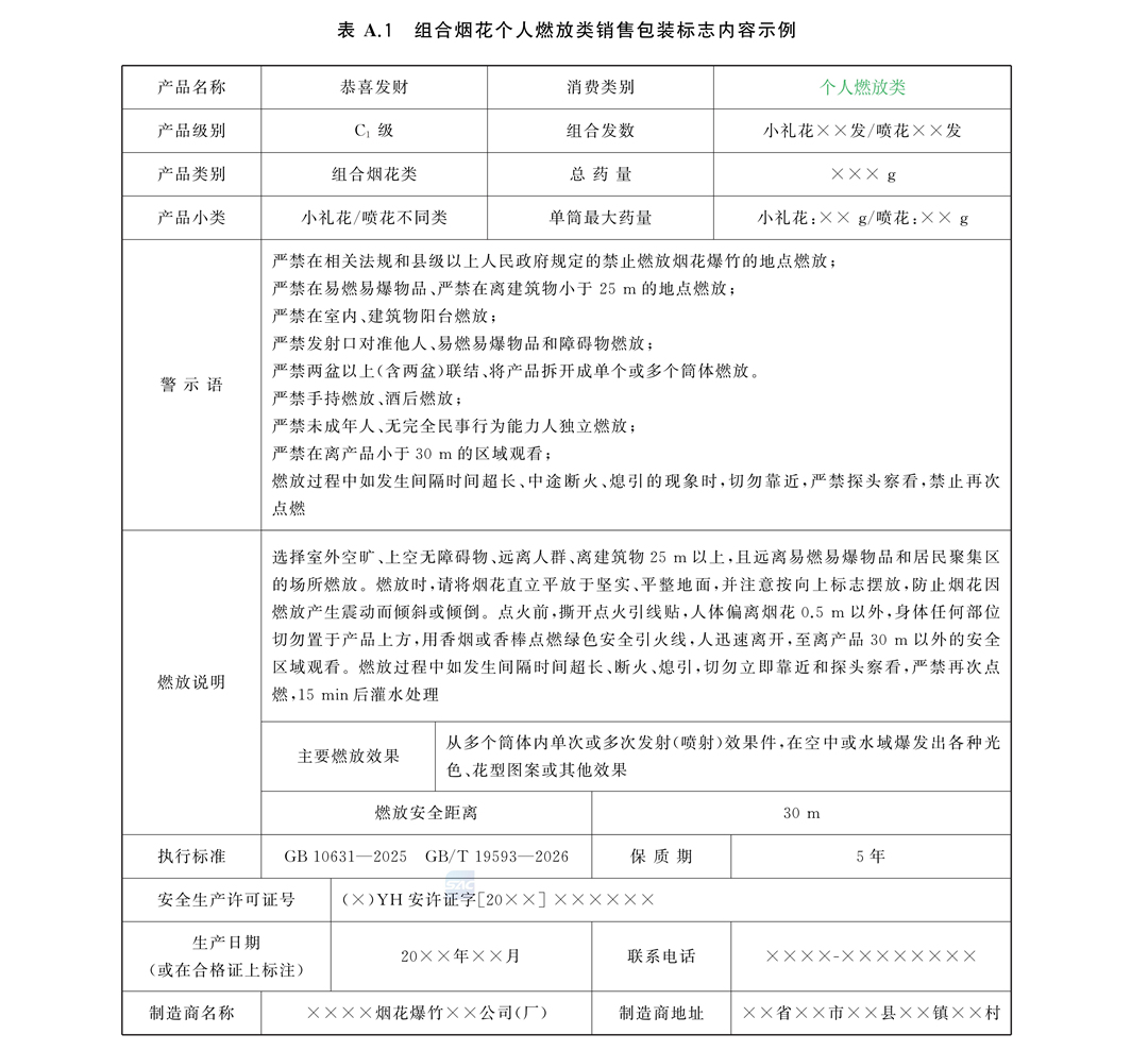 组合烟花包装标志和流向信息标签内容示例见表A.1、表 A.2和图A.1。