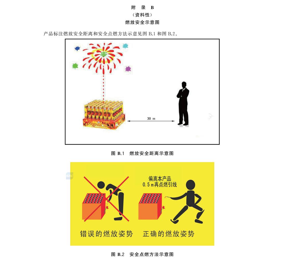 e) 标注附录B所示示意图或等同说明效果的示意图加以警示说明 。